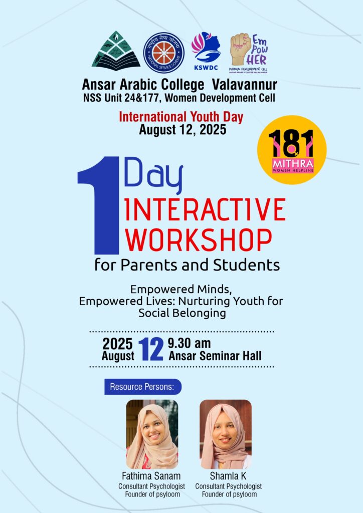 Valavannur: The NSS and Women Development Cell (WDC) of Ansar Arabic College, Valavannur, successfully organized a one-day interactive workshop on August 12 to mark International Youth Day.
