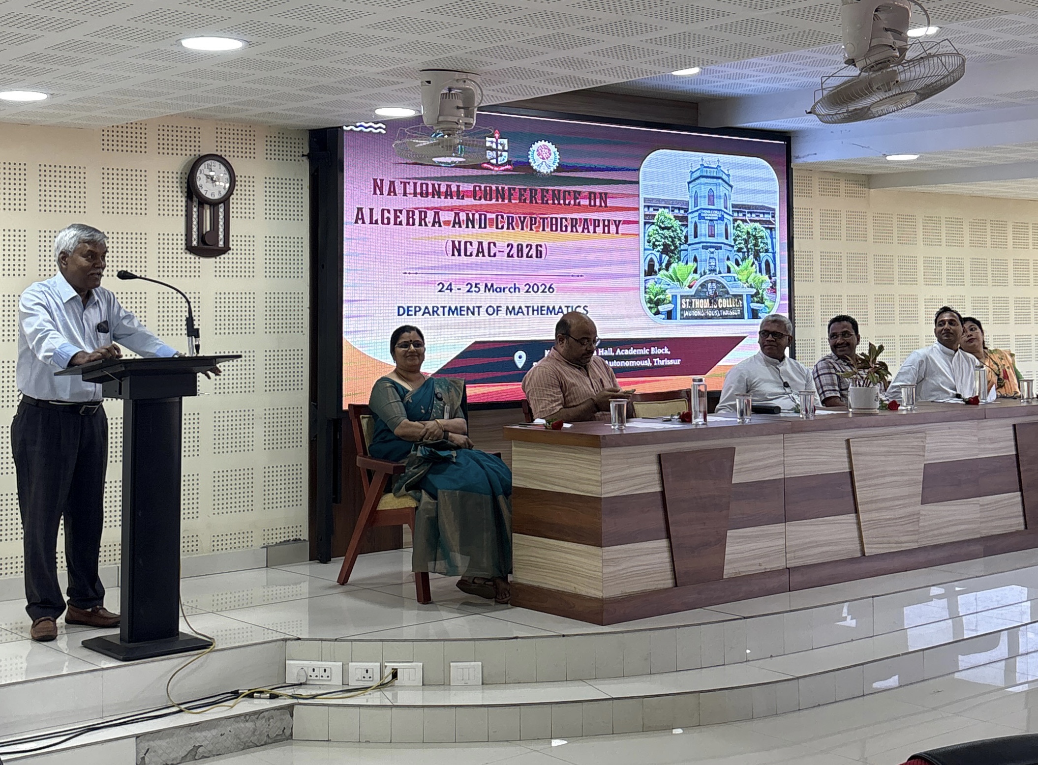 തൃശൂർ:  സെന്റ് തോമസ് കോളേജ് ഗണിതശാസ്ത്ര വിഭാഗത്തിന്റെ ആഭിമുഖ്യത്തിൽ കെ.എസ്.സി.എസ്.ടി.ഇ (KSCSTE), ഐ.ക്യു.എ.സി (IQAC) എന്നിവയുടെ സഹകരണത്തോടെ മാർച്ച് 24, 25 തിയ്യതികളിൽ സംഘടിപ്പിച്ച അൾജിബ്ര ആൻഡ് ക്രിപ്റ്റോഗ്രാഫി കോൺഫറൻസ്(NCAC-2026) വിജയകരമായി സമാപിച്ചു. കൊൽക്കത്ത ഐ.എസ്.ഐ മുൻ ഡയറക്ടർ പത്മശ്രീ പ്രൊഫ. ബിമൽ കുമാർ റോയ് ഉദ്ഘാടനം ചെയ്ത ചടങ്ങിൽ പ്രിൻസിപ്പൽ ഡോ. ഫാ. മാർട്ടിൻ കെ. എ. അധ്യക്ഷത വഹിച്ചു.   ഗണിതശാസ്ത്ര വിഭാഗം അസോസിയേറ്റ് പ്രൊഫസർ ഡോ. സാജു എം. ഐ-യുടെ സേവനസമ്പന്നമായ ഔദ്യോഗിക ജീവിതത്തിന് അദ്ദേഹത്തെ പ്രത്യേകമായി ആദരിച്ചു.   കോളേജ് എക്സിക്യൂട്ടീവ് മാനേജർ ഫാ. ബിജു പാണേങ്ങാടൻ, വകുപ്പ് മേധാവി ഡോ. വിജി എം, വൈസ് പ്രിൻസിപ്പാൾ ഡോ. ഫാ. അനിൽ ജോർജ് കെ,  ഐ.ക്യു.എ.സി കോർഡിനേറ്റർ ഡോ. ദിവ്യ ജോർജ്, ഡീൻ ഓഫ്  റിസർച്ച് ഡോ. ജോയ്സ് ജോസ്, അസിസ്റ്റന്റ് പൊഫസർ ആന്റണി ജോൺ ഇ. എഫ്., സ്റ്റുഡന്റ് കോർഡിനേറ്റർ ആതിര അശോക്  എന്നിവർ ചടങ്ങിൽ സംസാരിച്ചു.