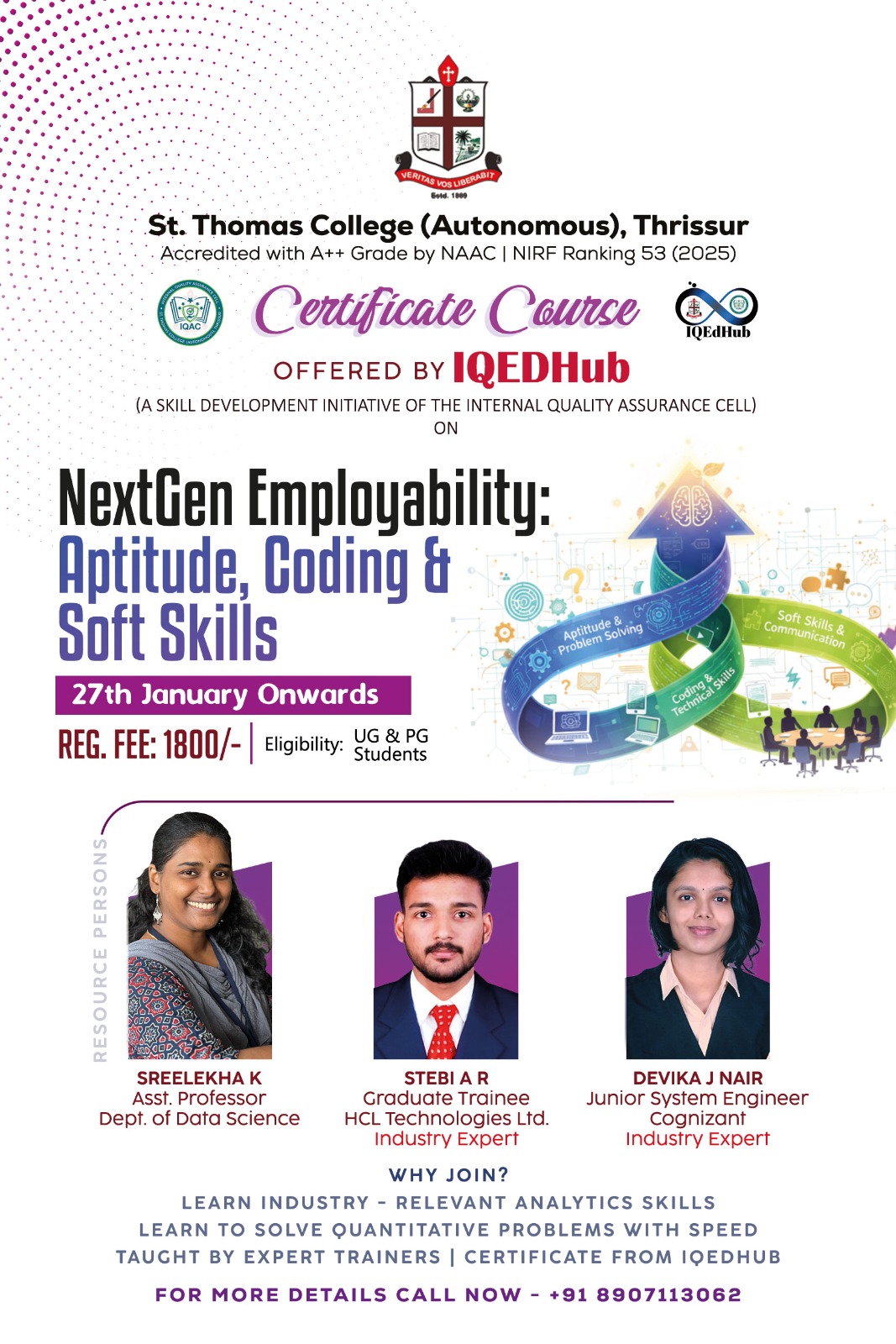 Click Below 👇 & Share This News WhatsApp Facebook Twitter LinkedIn CopyCopied THRISSUR: St. Thomas College (Autonomous), Thrissur, has announced a major new initiative to tackle the competitive job market. The college, in association with IQEdHub, offers a specialized NextGen Employability Certificate Course. Specifically, this program focuses on “Aptitude, Coding & Soft Skills.” The classes are scheduled to commence on January 27, 2026. Bridging the Skill Gap The Internal Quality Assurance Cell (IQAC) organized this skill development initiative. Crucially, the course aims to transform students into industry-ready professionals. Therefore, the curriculum targets final-year Undergraduate and Postgraduate students who are preparing for upcoming campus recruitments. Comprehensive Curriculum The 60-hour program uses a hybrid mode (Online + Offline) to ensure flexibility. First, it covers quantitative aptitude and logical reasoning, which are essential for clearing initial screening tests. Furthermore, students will receive practical coding exposure. The syllabus includes training in high-demand languages like C, Python, and Java. Additionally, the course places a strong emphasis on soft skills. Modules on leadership, teamwork, and professional conduct will prepare candidates for interviews and group discussions. Consequently, participants will develop a well-rounded professional persona. Learning from Experts A team of distinguished resource persons will lead the sessions. Notably, the panel includes industry experts like Stebi A R (Graduate Trainee, HCL Technologies Ltd.) and Devika J Nair (Junior System Engineer, Cognizant). Moreover, Sreelekha K (Asst. Professor, Dept. of Data Science) brings academic rigor to the training. Registration Details Ultimately, this is a prime opportunity for students to enhance their resumes. The registration fee is set at ₹1800. Thus, interested students should secure their spots immediately. Register Here: Click to Register Contact: +91 89071 13062 In summary, the NextGen Employability Certificate Course promises to be a game-changer for career-focused students at St. Thomas College. Click Below 👇 & Share This News WhatsApp Facebook Twitter LinkedIn CopyCopied Post navigation തൃശൂർ സെന്റ് തോമസ് കോളേജ്, കേരള ഉന്നത വിദ്യാഭ്യാസ വകുപ്പുമായി ചേർന്ന് കൊണ്ട്, 5 ദിവസത്തെ ഫെക്കലിറ്റി ഡെവലപ്പ്മെന്റ് പ്രോഗ്രാം സംഘടിപ്പിച്ചു. Basics of Business Analytics Course: Online Training by St. Thomas College