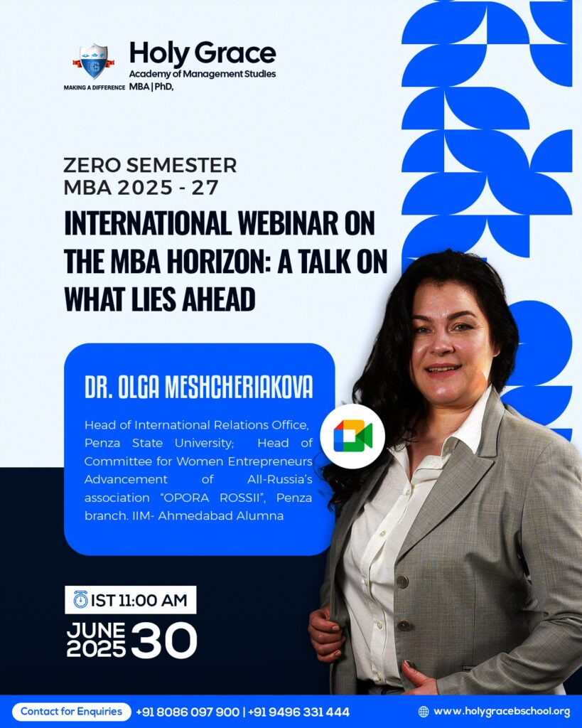 Click Below 👇 & Share This News WhatsApp Facebook Twitter LinkedIn CopyCopied Date: 30th June 2025Time: 11:00 AM ISTPlatform: Google MeetTarget Audience: MBA 2025-27 Batch (Zero Semester)Organized by: Holy Grace Academy of Management Studies, Mala, Kerala 🌍 A Global Kickstart to the MBA Journey in Kerala Holy Grace Academy of Management Studies, Mala, hosted an inspiring international webinar titled “The MBA Horizon: A Talk on What Lies Ahead” on 30th June 2025. This was the second academic event of the Zero Semester, tailored for the newly inducted MBA 2025-27 batch. The session aimed to introduce students to the global scope of MBA education and upcoming trends in the business world. 🎙️ Distinguished Guest Speaker: Dr. Olga Meshcheriakova The keynote speaker was Dr. Olga Meshcheriakova, a globally renowned academic and alumna of IIM Ahmedabad. She currently heads the International Relations Office at Penza State University, Russia, and serves as the Chairperson of the Committee for Women Entrepreneurs Advancement, OPORA ROSSII. Dr. Olga shared rich insights on: The evolving landscape of global MBA education Entrepreneurial thinking and leadership development The value of international exposure and cross-border collaboration The significance of lifelong learning for future managers 📌 Event Highlights Overview of global MBA trends and opportunities Discussion on future-ready skills in management Encouragement to pursue innovation and collaboration Interactive Q&A session with the speaker Valuable guidance for student career planning 👥 Active Participation from Kerala’s Future Managers More than 50 participants, including students, faculty members, and invited academicians, joined the live webinar via Google Meet. Students from Kerala actively asked questions and interacted with the speaker. This lively exchange made the session vibrant and memorable. 🌟 A Powerful Start for the Holy Grace MBA 2025-27 Batch This international webinar set a powerful tone for the academic journey ahead. It showcased Holy Grace Academy’s commitment to global learning, industry insights, and holistic development. Such events are not just sessions—they are gateways to new perspectives for Kerala’s future business leaders. 📢 What Next? Are you an aspiring MBA student in Kerala?Follow Campus Round for more such updates from top B-schools like Holy Grace, Mala. 🎓 Stay Connected with Campus Round!Want the latest campus updates, student achievements, sports highlights, events, Campus News and more — right on your phone? 👉 Join our WhatsApp Group to never miss a story! 📢 Share your School/College News Here?We love featuring student stories, event updates, and campus highlights from across the country! ✍️ Click here to publish your campus updates on CampusRound.com Click Below 👇 & Share This News WhatsApp Facebook Twitter LinkedIn CopyCopied Post navigation 🚀 SPECTRUM 2K25: National Level Intercollegiate Fest at Holy Grace Academy, Mala