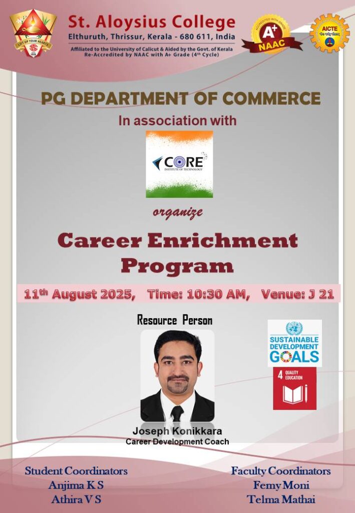 The PG Department of Commerce, St. Aloysius College, Elthuruth, in association with CORE Institute of Technology, successfully hosted a Career Enrichment Program on 11th August 2025 at J21 Hall. The event focused on boosting career skills, industry readiness, and employability for students in Kerala.