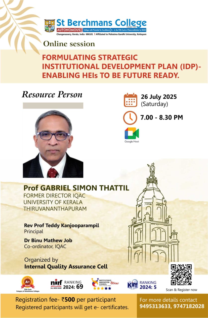 Click Below ๐ & Share This News WhatsApp Facebook Twitter LinkedIn CopyCopied Empowering Keralaโs Higher Educational Institutions to Become Future-Ready The Internal Quality Assurance Cell (IQAC) of St. Berchmans College, Changanacherry, is organizing a powerful online session that will benefit leaders of Higher Educational Institutions (HEIs) across Kerala. ๐ฏ Topic: Formulating Strategic Institutional Development Plan (IDP) โ Enabling HEIs to Be Future Ready๐ Date: Saturday, 26 July 2025๐ Time: 7:00 PM๐ป Mode: Online๐จโ๐ซ Resource Person: Prof. Gabriel Simon Thattil, Former Director, IQAC, University of Kerala ๐ Event Highlights This expert-led session aims to support academic leaders in Kerala in designing Institutional Development Plans (IDPs) that align with: National education priorities NAAC and NEP 2020 guidelines Long-term institutional goals By attending, youโll gain insights on how to make your institution more vision-driven, student-centric, and future-ready. ๐ Who Should Attend? This programme is specially designed for: Principals Vice Principals IQAC Coordinators Academic Deans Education Managers Heads of Institutions across Kerala If you’re shaping the future of education in Kerala, this session is for you. ๐ง About the Expert Speaker Prof. Gabriel Simon Thattil, the former IQAC Director at the University of Kerala, is a recognized thought leader in institutional planning. His insights have helped numerous colleges across Kerala strengthen their academic roadmap. ๐ Why This Matters for Kerala’s Academic Community Kerala has always led the way in education. This session brings together academic leaders from across the state to collaborate and innovate for a stronger future. Letโs continue to make Keralaโs education sector a model for the nation. โ Registration Details ๐ Register now: Click here to register๐ฑ For more information, contact: 9495313633 or 9747182028 Don’t miss this chance to transform your institution’s future! ๐ฃ Call to Action If youโre part of an HEI in Kerala, share this news with your colleagues.๐ฌ Drop a comment below and tell us what you look forward to learning!๐ Stay updated on campus events in Kerala by following CampusRound.com. ๐ Stay Connected with Campus Round!Want the latest campus updates, student achievements, sports highlights, events, Campus News and more โ right on your phone? ๐ Join our WhatsApp Group to never miss a story! ๐ข Share your School/College News Here?We love featuring student stories, event updates, and campus highlights from across the country! โ๏ธ Click here to publish your campus updates on CampusRound.com Click Below ๐ & Share This News WhatsApp Facebook Twitter LinkedIn CopyCopied Post navigation St. Berchmans College to Host 2-Day Online Workshop on AI Tools for Academic Research เดเดธเตเดฌเดฟ เดเตเดณเตเดเดฟเตฝ เดจเดเดจเตเดจ เดฌเดฟเดฐเตเดฆเดฆเดพเดจเดเตเดเดเดเตเดเต เดชเตเดฐเตเดซ. เดธเดฟ.เดเดฟ. เด เดฐเดตเดฟเดจเตเดฆเดเตเดฎเดพเตผ เดเดฆเตเดเดพเดเดจเด เดเตเดฏเตเดคเต