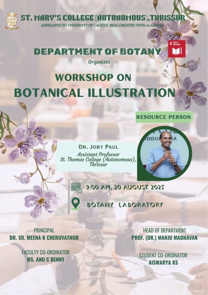 The Department of Botany, St. Mary’s College (Autonomous), Thrissur, organized a workshop on botanical illustration on 20th August 2025 at the Botany Laboratory. The event offered students a unique opportunity to learn the art of scientific plant drawing, blending accuracy with creativity.