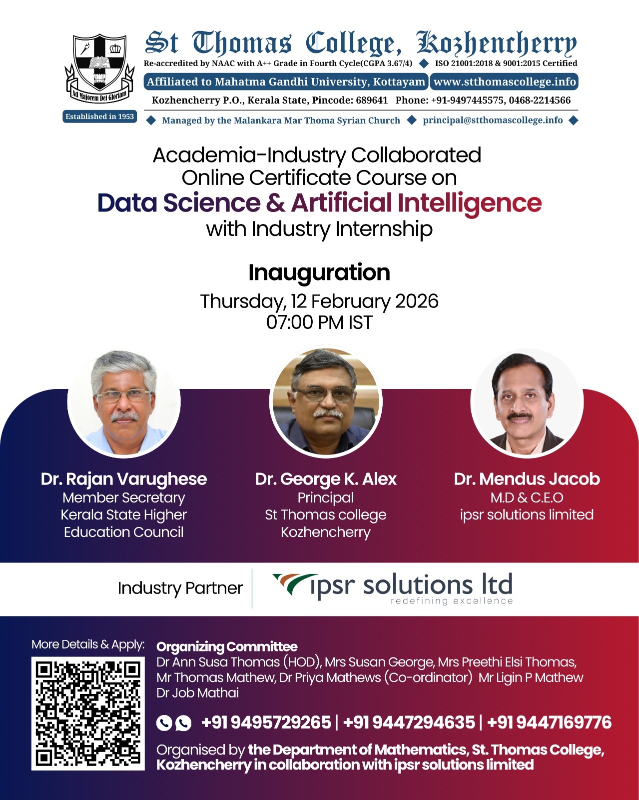 Click Below 👇 & Share This News WhatsApp Facebook Twitter LinkedIn CopyCopied St. Thomas College, Kozhencherry in collaboration with ipsr solutions limited is offering an online Add-On Certificate Course in Data Science & Artificial Intelligence. 🎓 Enroll Now!Participants will get an opportunity to avail free internship from IPSR, a public limited IT company that creates innovative AI platforms & smart tech solutions. ⏰Start Date & Time: 12 February 2026, 07:00 PM ✅ 30 Hrs Online Training + 4-Week / 8-Week Free Internship✅ Flexible timing without affecting your academic schedule✅ Live Projects & Practical Exposure – Experience AI from the Company that Builds AI✅ Dual Certificates (Course + Internship) 👉 Open to all Diploma, UG, FYUGP, BTech & PG students – Limited Seats! ✨ Know more and Enroll: https://www.ipsr.org/certificate-course-stthomas-college-kozhencherry-data-science-artificial-intelligence-internship 🎓 Stay Connected with Campus Round!Want the latest campus updates, student achievements, sports highlights, events, Campus News and more — right on your phone? 👉 Join our WhatsApp Group to never miss a story! 📢 Share your School/College News Here?We love featuring student stories, event updates, and campus highlights from across the country! ✍️ Click here to publish your campus updates on CampusRound.com Click Below 👇 & Share This News WhatsApp Facebook Twitter LinkedIn CopyCopied Post navigation Two Day National Seminar on Leveraging Financial Investment to Enhance Inclusive Growth @ St. Thomas College, Kozhencherry